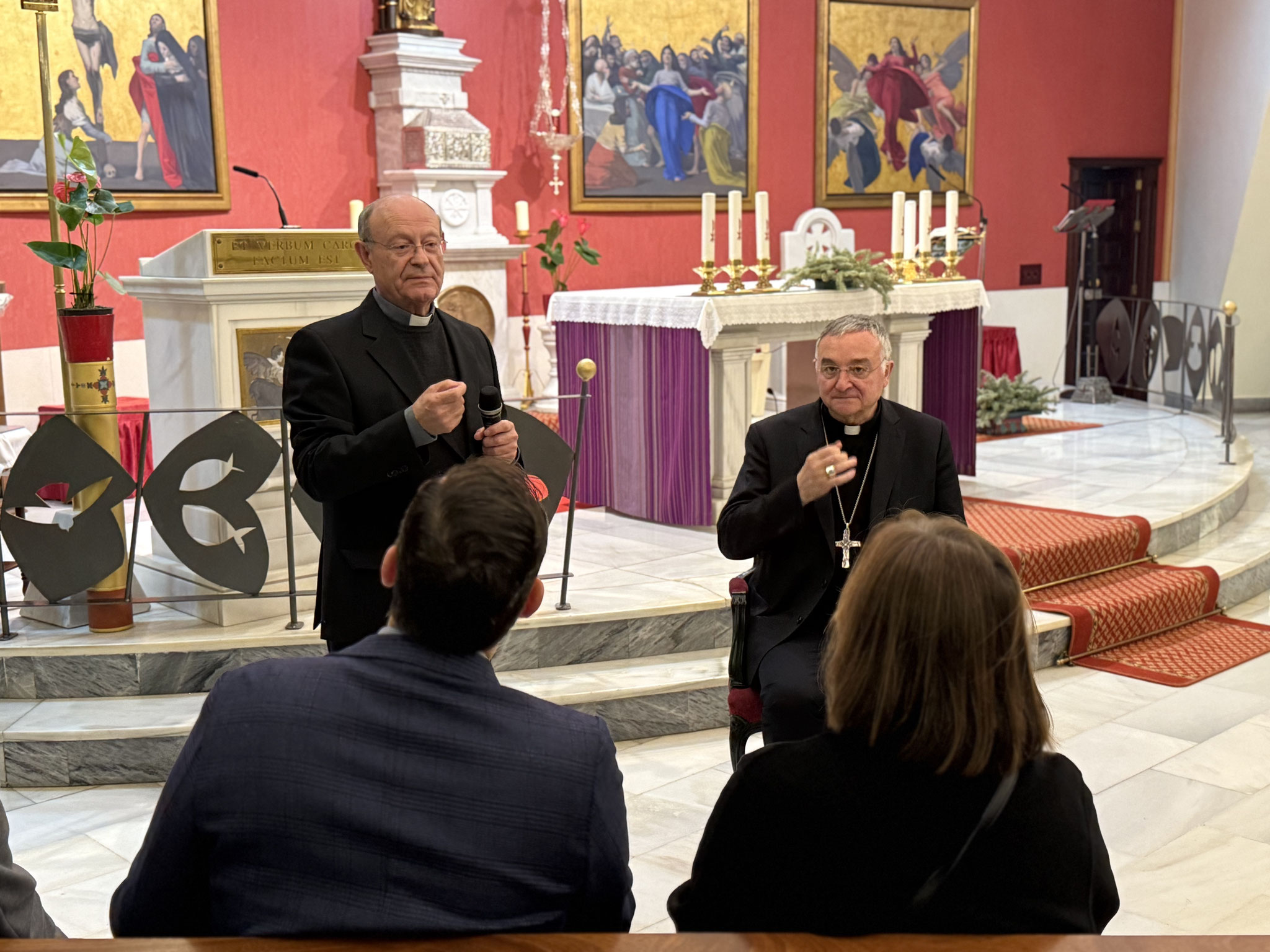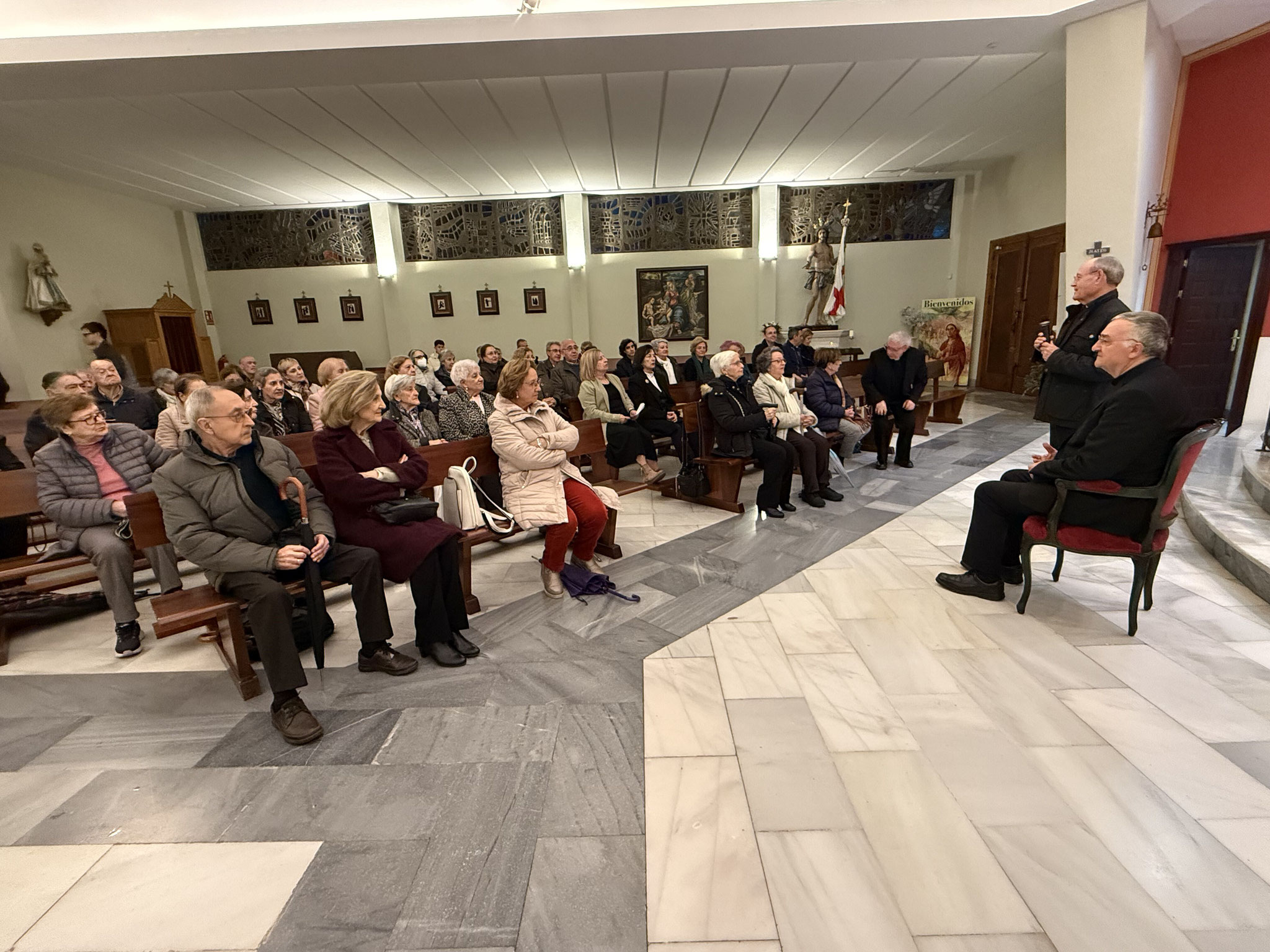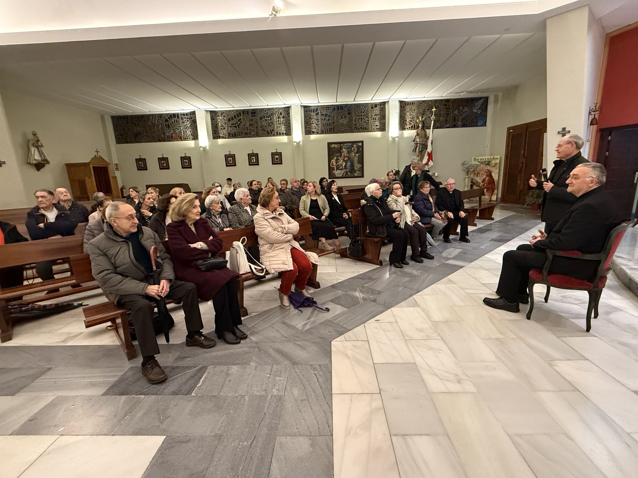 Al mediodía se celebró encuentro con profesores y alumnos del Colegió EIN de la Divina Infantita coincidió con la fiesta adelantada del fundador de las Religiosas de la Inmaculada Niña, Padre Federico Salvador Ramón. Con este motivo el claustro de profesores y personal no docente preparó un café que facilitó la posibilidad de un diálogo cercano y distendido. A este encuentro con profesores siguió un saludo a los grupos de alumnos que preparaban actividades en torno a la fiesta del fundador, la visita a los más pequeños que le enseñaron al Obispo el huerto ecológico, y dos sesiones de intercambio y preguntas en el salón de actos de los niños de primaria y secundaria. El encuentro con los escolares terminó con la visita a la capilla donde el Obispo dirigió un momento de oración centrado en el Padrenuestro.