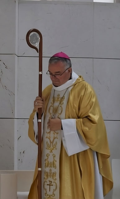 Al Obispo se le llama también pastor de la Iglesia. Fíjate que en la mano derecha lleva un bastón grande que representa la misión de cuidar a los cristianos. Este bastón se llama báculo. También en el día de su ordenación al Obispo le ponen un anillo en el dedo anular de la mano derecha que le recuerda el compromiso de amar siempre a la Iglesia.
